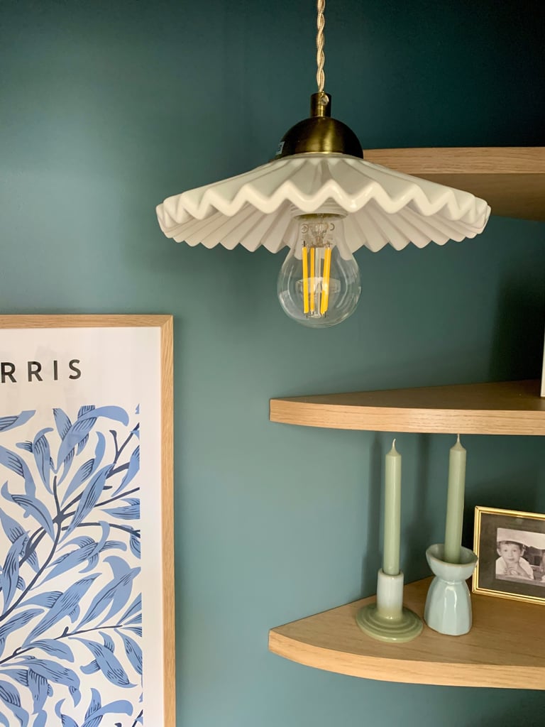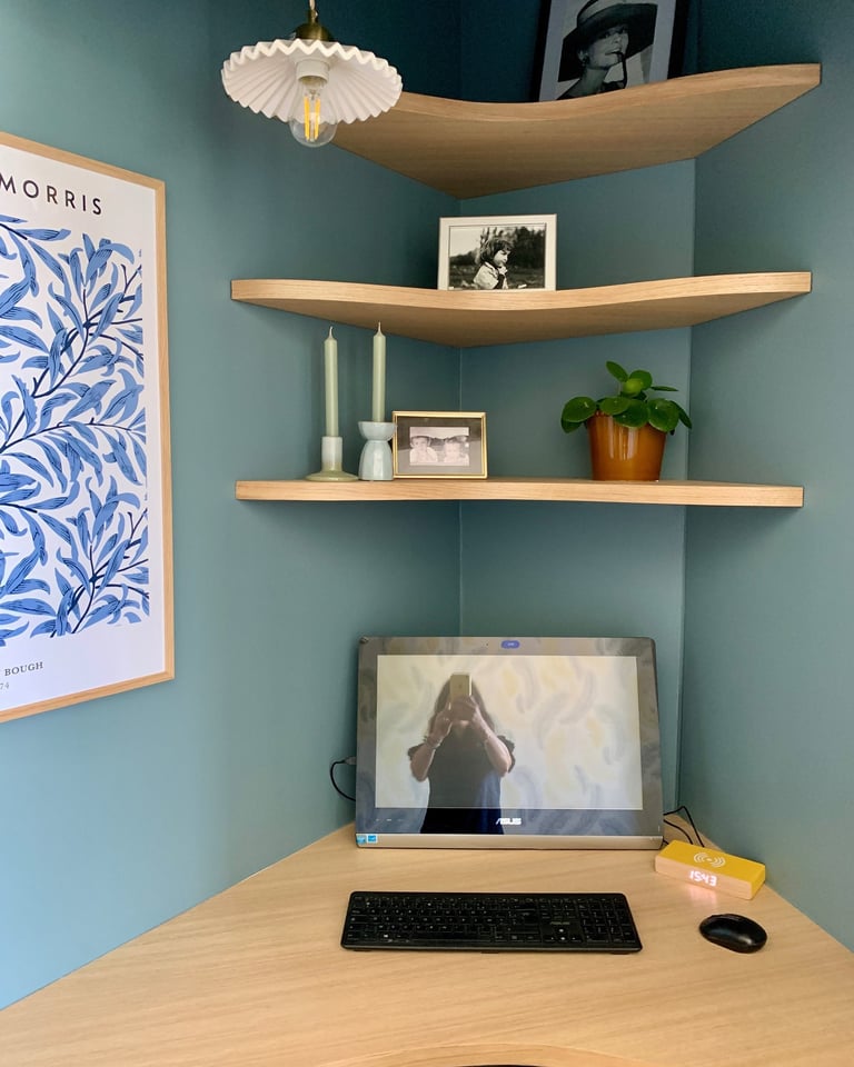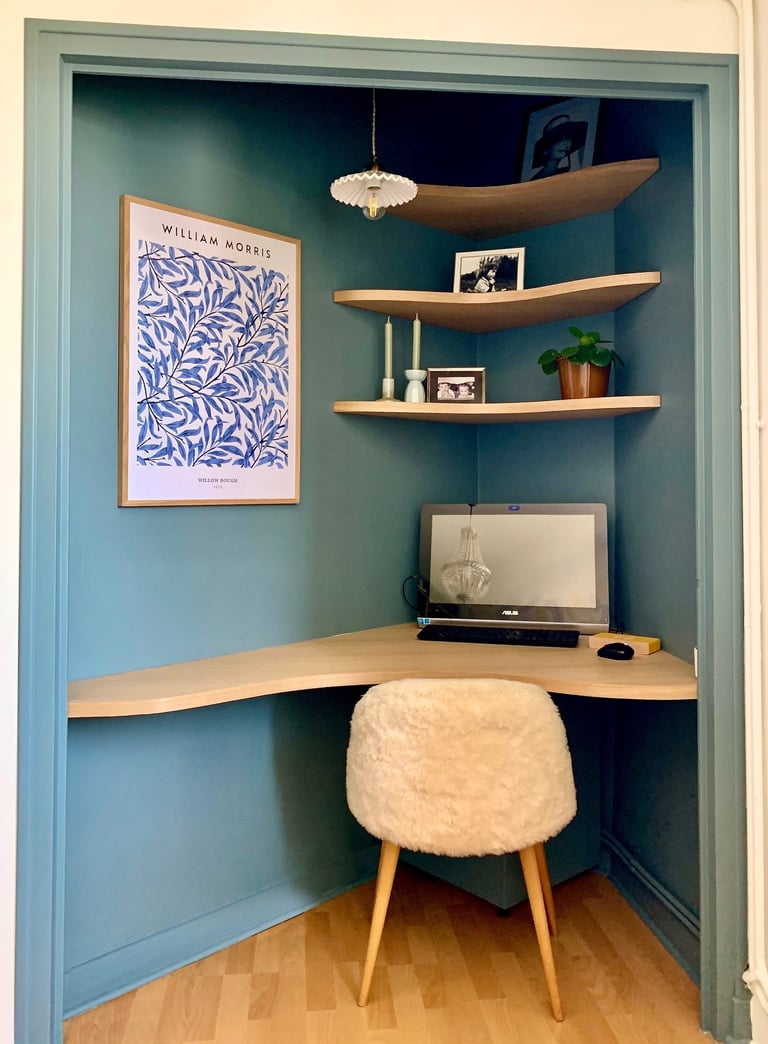 Le choix d’une teinte douce sur les murs permet de structurer le coin bureau tout en créant une ambiance propice à la concentration. Les étagères et rangements intégrés offrent des surfaces de pose fonctionnelles, tout en restant légers et élégants.