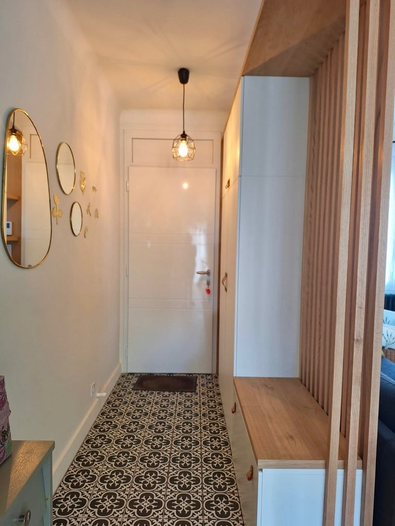 L’entrée manquait de structure et de rangements, ce qui rendait la transition entre l’entrée et le salon peu lisible. Les clients souhaitaient une solution permettant de délimiter les espaces sans cloisonner, tout en intégrant les fonctions essentielles du quotidien : penderie, rangement, et assise.