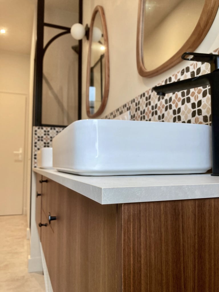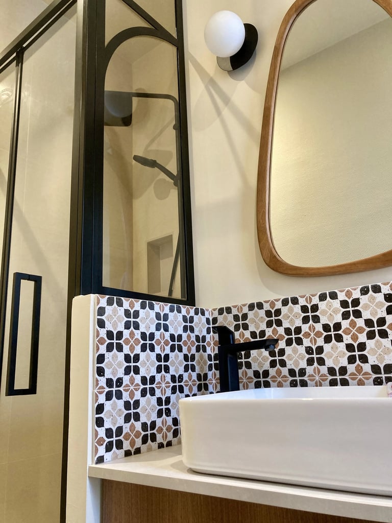 Une verrière a été intégrée afin d’apporter de la lumière naturelle et de structurer visuellement l’espace. L’ensemble est sublimé par une palette chaleureuse mêlant bois, teintes beige lumineuses et motifs artisanaux, apportant du caractère et de la douceur à cette salle de bain.